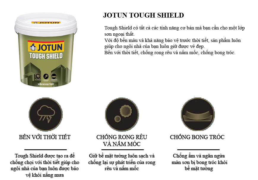 Tough Shield có tất cả các tính năng cơ bản mà bạn cần cho một lớp sơn ngoại thất. Với độ bền màu và khả năng bảo vệ trước thời tiết, sản phẩm giúp ngôi nhà của bạn luôn giữ được vẻ đẹp. •Bền với thời tiết •Chống rong rêu & nấm mốc •Chống bong tróc